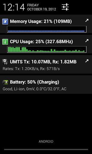 Quick access basic system information Android platform, including information, memory, SD Card, running processes, network states applications.